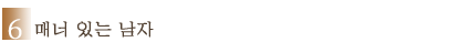 식당에 들어갈 때 문을 열어주고, 식사를 끝마치면 냅킨을 건네주는 등 남자의 매너는 여자에게 로맨틱한 기분을 선사해준다. 여자는 '레이디 퍼스트'를 모토로 삼는 영국식 신사를 좋아한다. 자신을 왕비처럼 대접해주는 깔끔한 매너를 지닌 남자를 마다할 여자는 없다. 매너가 있다는 것은 어찌 보면 연약한 여자를 배려해주는 행위이다. 그러므로 보호 받고 싶어하는 여자들로써는 이런 남자를 선호하는 게 당연하다. |